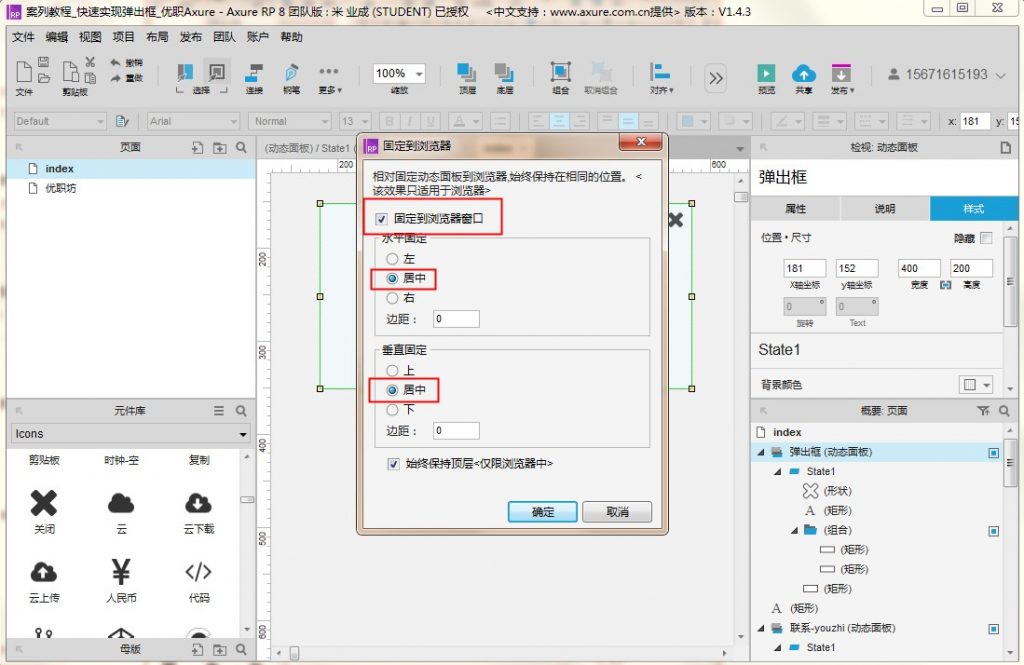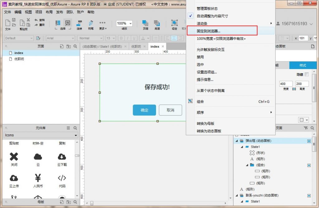 5、选中【弹出框】动态面板,右键选择【固定到浏览器】