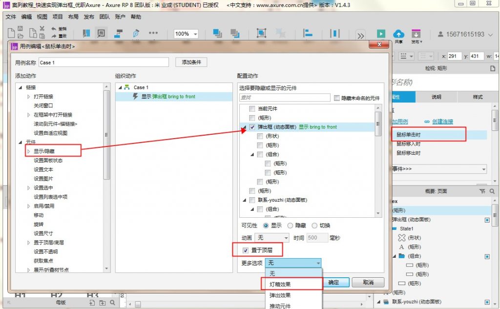 8、重头戏来啦,此处是关键~~,选中弹出框按钮,添加交互事件【鼠标单击时】,添加动作【显示/隐藏】,选中【弹出框】动态面板,勾选【置于顶层】,更多选项选择【灯箱效果】,点击确定(此处设置灯箱效果是关键,这是axure自带的效果,可以给动态面板带上蒙层,蒙层的颜色也是可以设置的)
