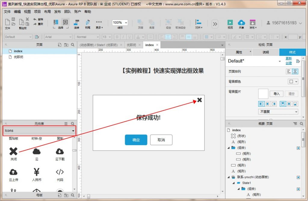 3、切换元件库为【Icons】,找到关闭图标,拖入画布中,调整按钮宽高到合适尺寸这里设置为【宽:16】、【高:16】(记笔记啦~~)