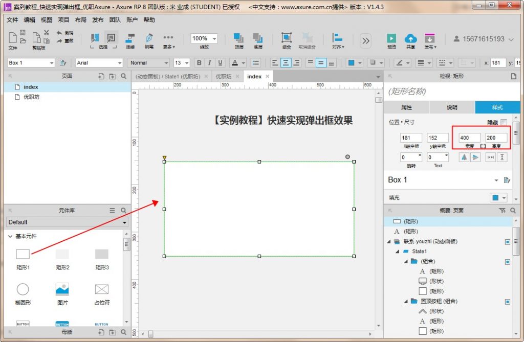 1、拖入矩形,调整矩形宽高【宽:400】、【高:200】(宽高可随意定,这里取比较常用的弹出框高度,可以拿小本本偷偷做做笔记哟~~)
