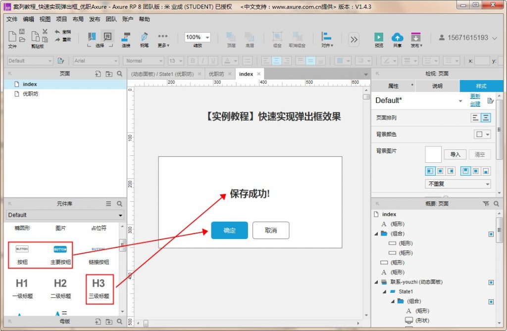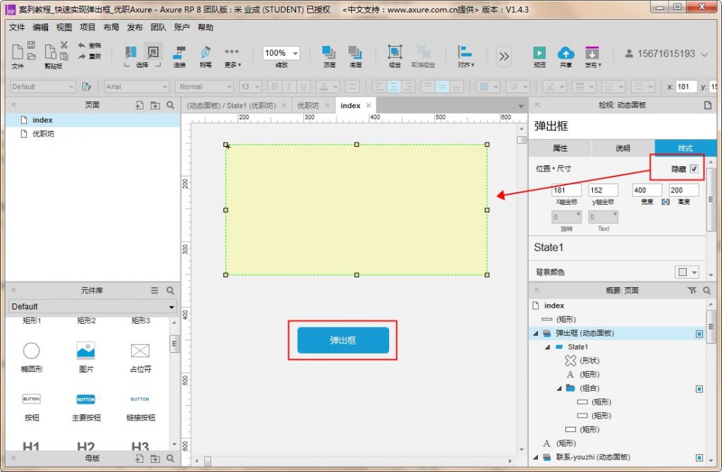7、选中弹出框,点击【隐藏】,拖入一个按钮(默认情况下弹出框是隐藏不可见的,点击按钮可显示弹出框)