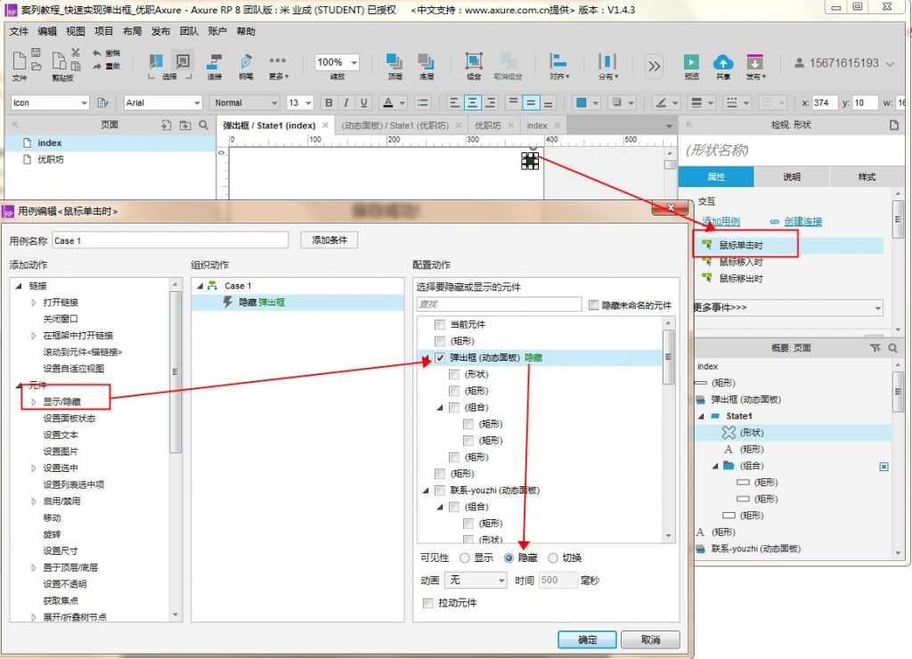 9、进入弹出框动态面板,选中删除按钮,添加交互事件【鼠标单击时】,添加动作【显示/隐藏】,选中【弹出框】动态面板,可见性选择【隐藏】,点击确定