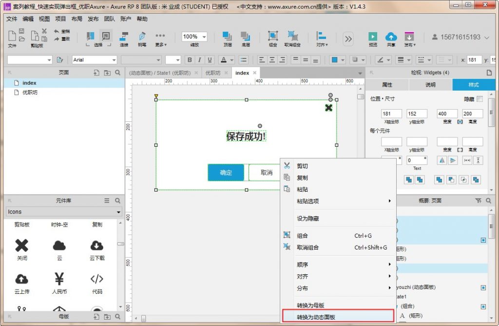 4、选中矩形框、文字、按钮、删除图标,右键选择【转换为动态面板】,并命名为【弹出框】