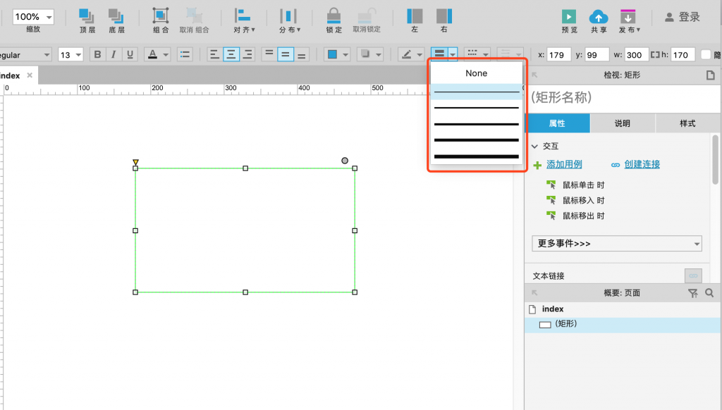【Axure9基础教程】Axure9新特性可自由设置边框线宽度大小 院长大大 • 2020年3月18日 pm7:47 • 基础教程 • 阅读 4734 在Axure8中设置边框线宽度是有限制的,Axure内置了1px/2px/3px/4px/5px,5种宽度,只能在这些宽度中选择,想要更宽的就不行了 到了Axure9将下拉框选择变成了文本输入,这就意味着可以自行设置边框线宽度大小,即便是设置为100也是可以的,大大增加了设置边框线的灵活度 原创文章,作者:院长大大,如若转载,请注明出处:https://www.axureschool.cn/351.html 发表评论 请登录后评论...登录后才能评论 发表