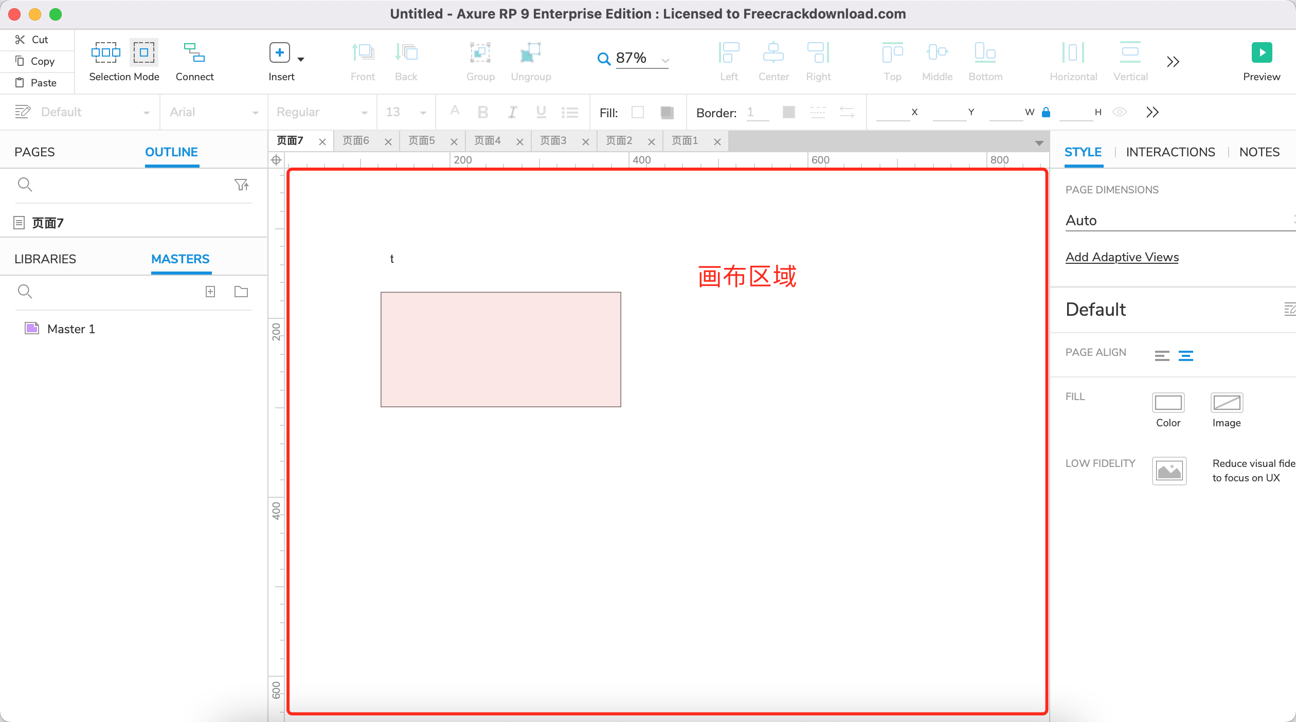 画布区域即绘图区域,为软件操作的主要区域。也是原型制作的编辑区域。Axure可以做到基本的编辑预览的效果(注:有些交互事件的触发需要进行预览)。