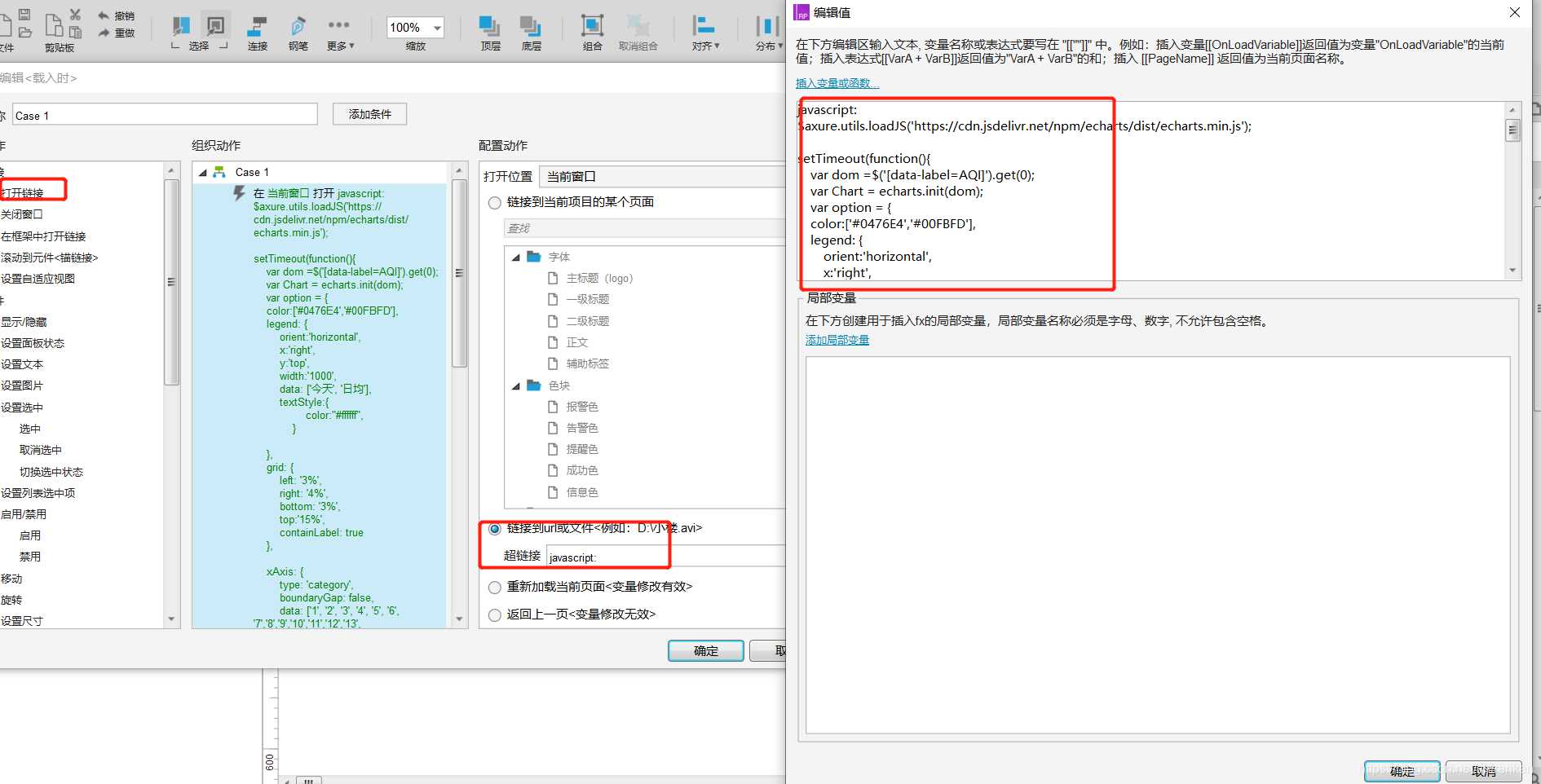 增加交互事件,【载入时】打开链接,【超链接到】写入javascript 的代码实现echarts的引用,如下图