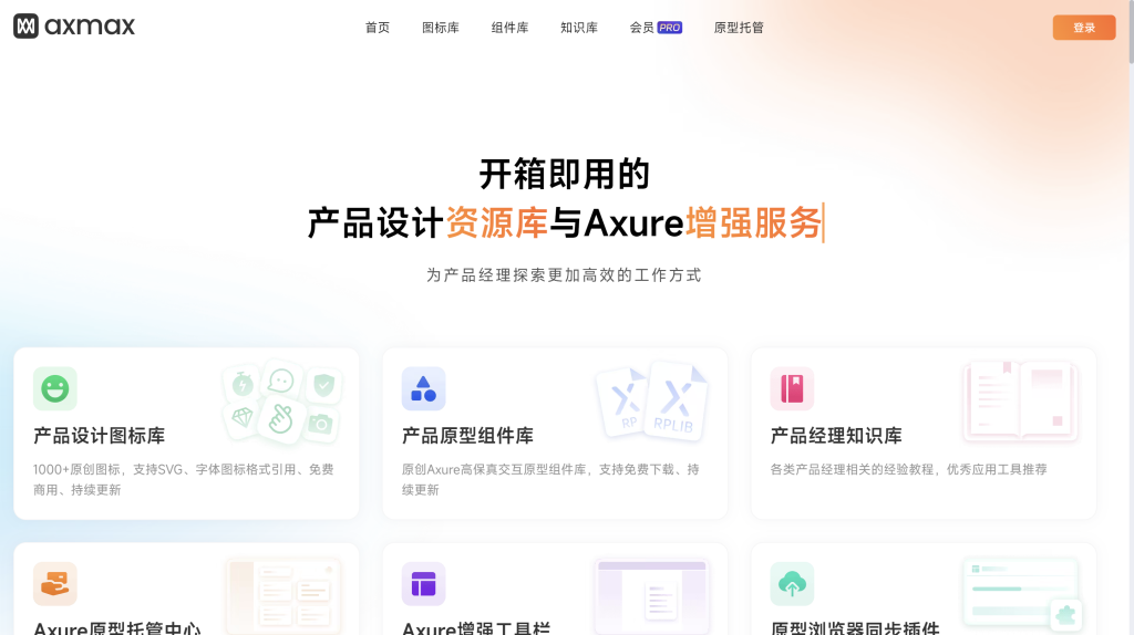 为产品经理探索更加科学高效的工作方式,产品设计图标库:1000+原创图标,支持SVG、字体图标格式引用、免费商用、持续更新;产品原型组件库:原创Axure高保真交互原型组件库,支持免费下载、持续更新;产品经理知识库:每日更新产品经理相关的经验教程,各类优秀工具应用推荐;Axure原型托管:支持Axure各版本原型一键托管,稳定免费,提供增强版Axure工具栏、高速同步插件等
