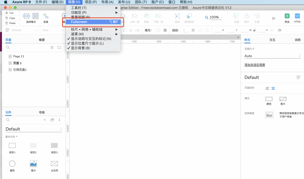 全屏模式可以将Axure占满整个电脑屏幕,从而最大化的显示编辑区域